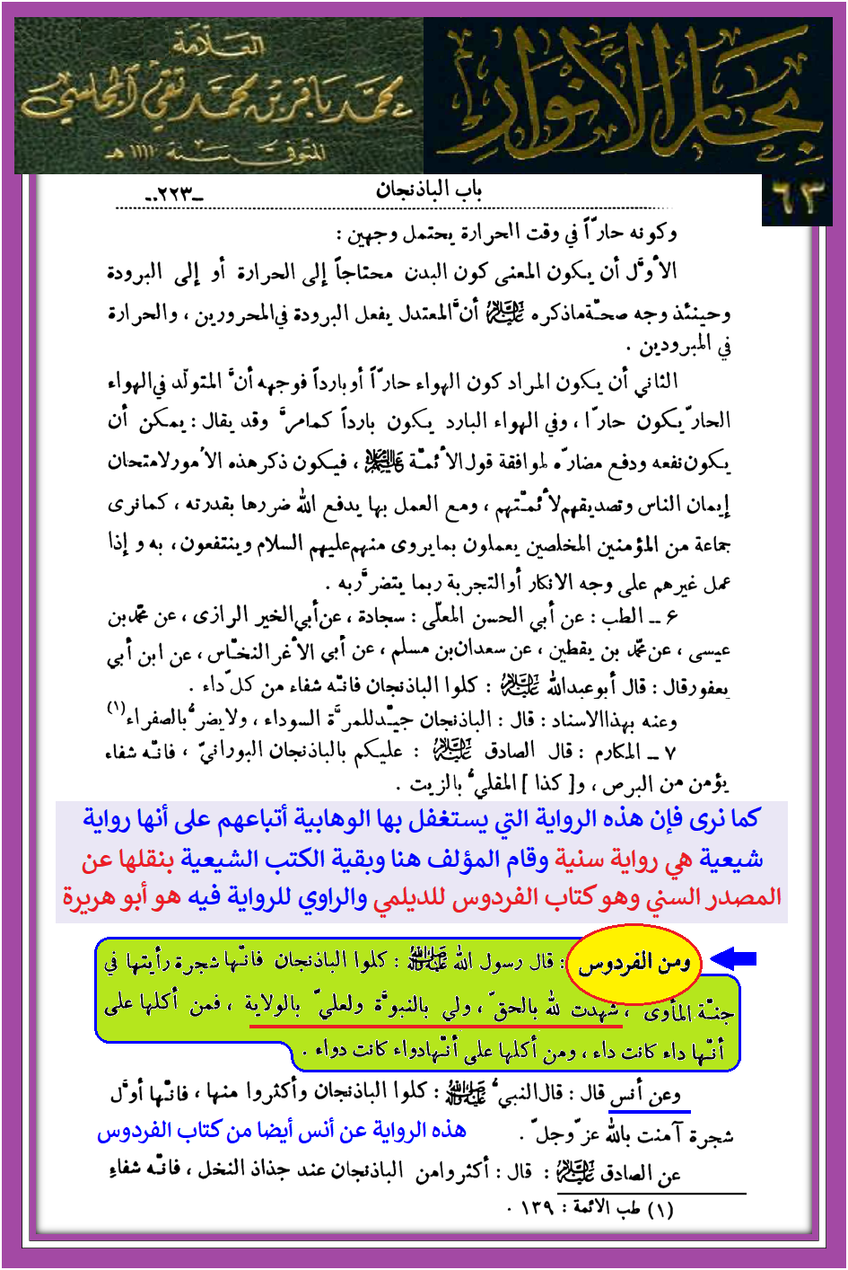 العلامة المجلسي ينقل الرواية ويبين مصدرها وهو كتاب الفردوس بمأثور الخطاب وهو كتاب سني