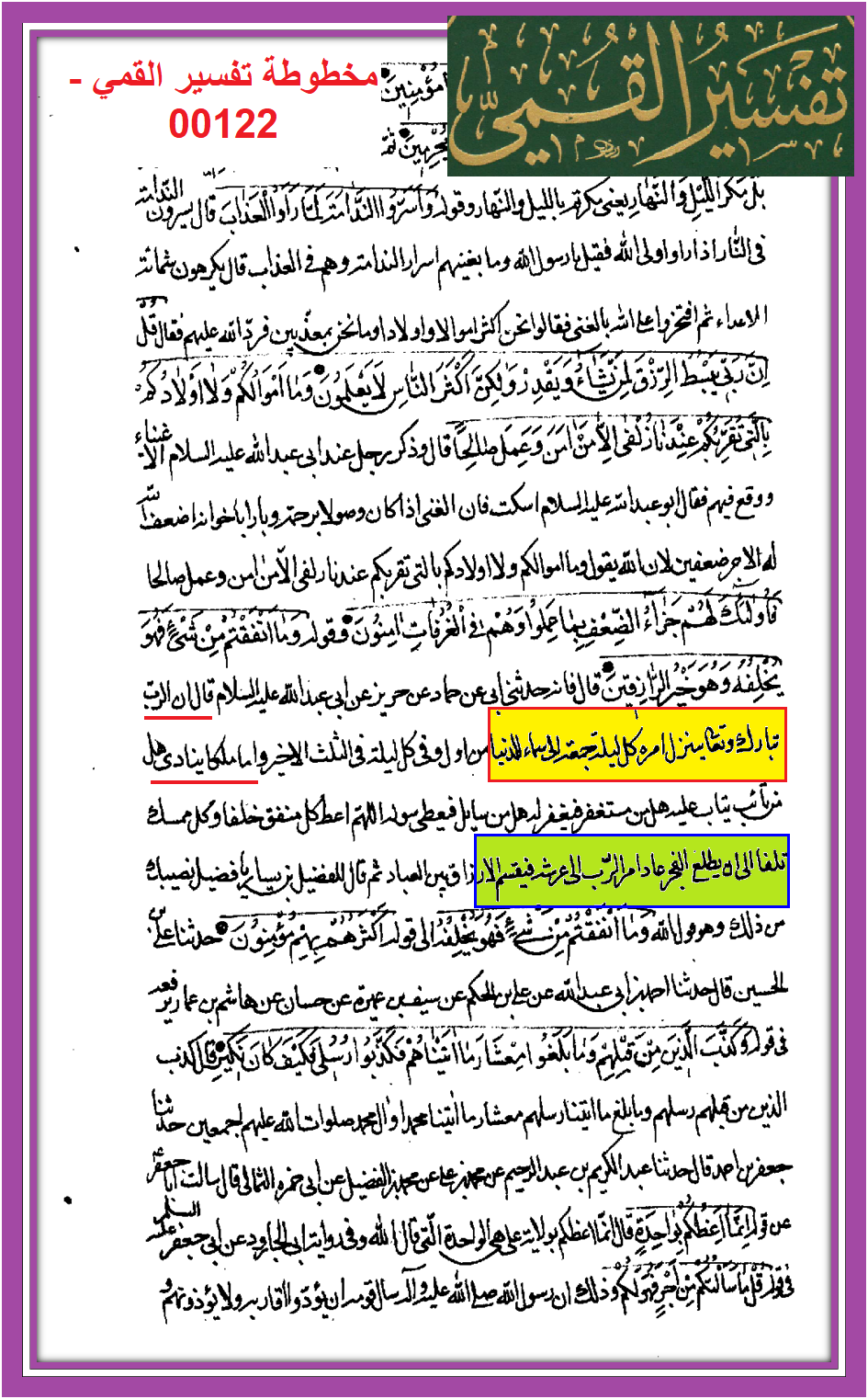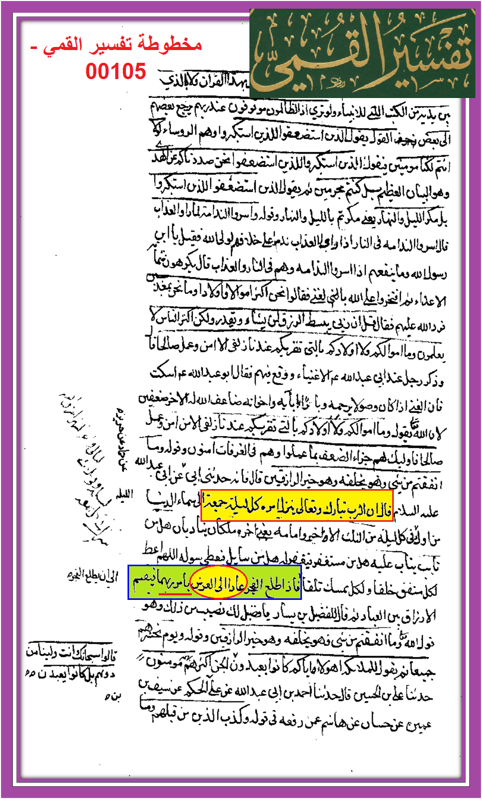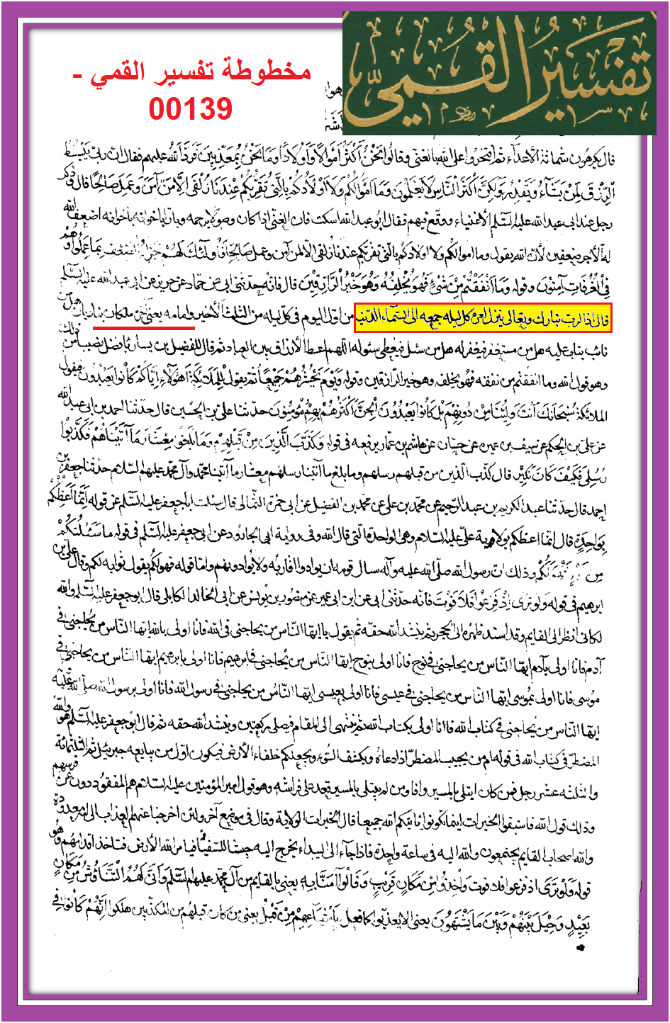 ونضيف أيضا عدة نسخ لمخطوطات كتاب تفسير القمي وفيها اللفظ الذي بيناه بل وقاله العلامة المجلسي في كتابه بحار الأنوار أيضا